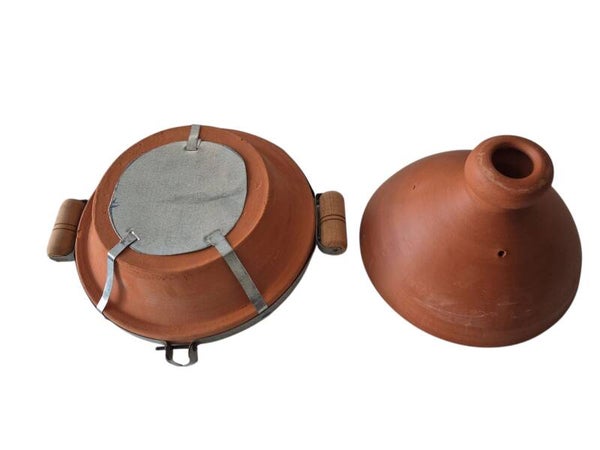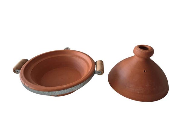 Marokkaanse tajine op traditionele wijze handgemaakt en van aardewerk, niet geglazuurd.